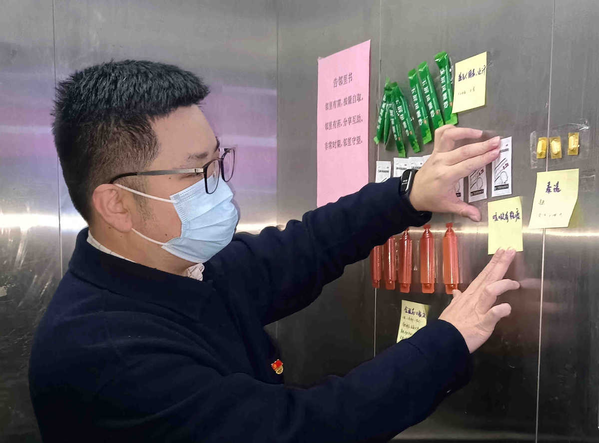 A donor sticks medicine on the wall of an elevator in a compound in Hangzhou, Zhejiang province, on Dec 22. DONG XUMING/FOR CHINA DAILY