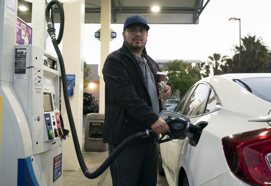 A man pumps gasoline into his car at a gas station in Millbrae, California, the United States, May 16, 2022. (Photo by Li Jianguo/Xinhua)