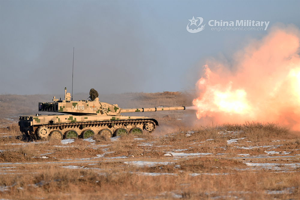 Soldiers assigned to a tank element of a combined-arms brigade under the PLA 81st Group Army fire cannons from a main battle tank at simulated targets during a recent live-fire tactical training exercise. (eng.chinamil.com.cn/Photo by Yang Pengfei and Li Changxing)