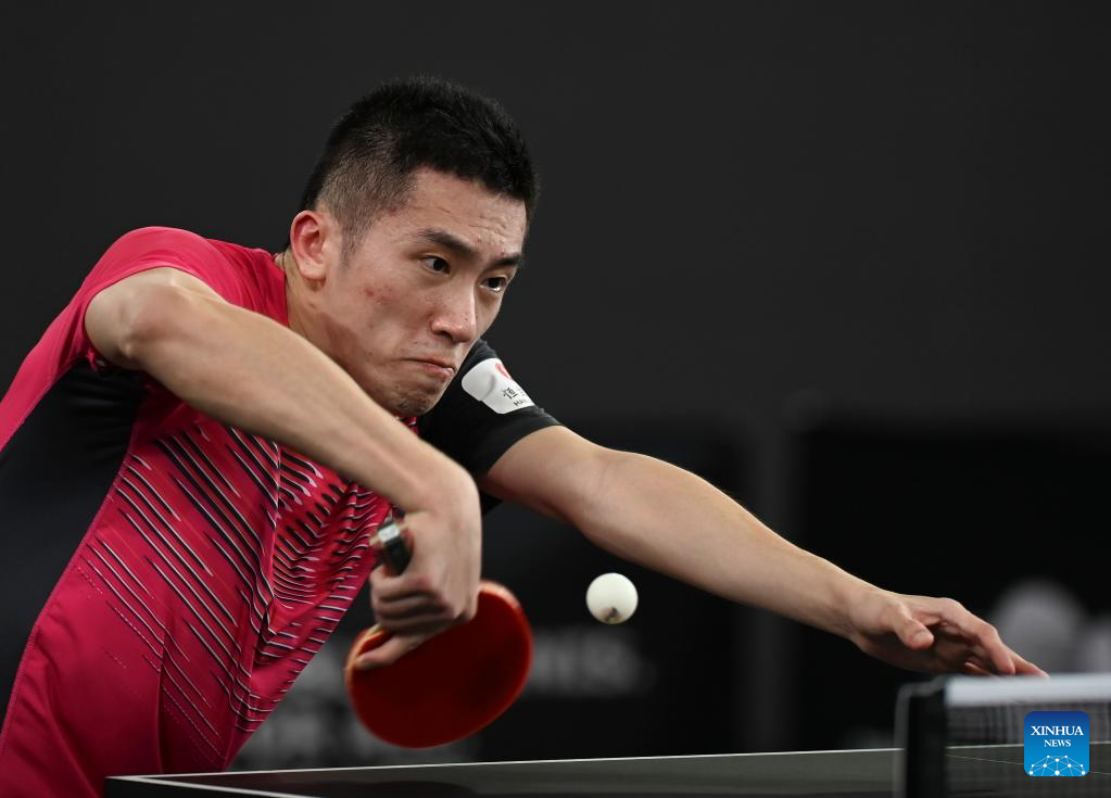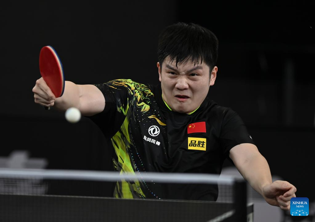 Fan Zhendong of China hits a return during the men's singles round of 32 match against Harmeet Desai of India at World Table Tennis Championships (WTTC) Asian Continental Stage in Doha, Qatar, Jan. 10, 2023. (Photo by Nikku/Xinhua)