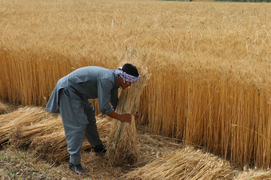 A farmer harvests wheat in Bamyan province, Afghanistan, July 21, 2022. (Photo by Ziaodin Azad/Xinhua)