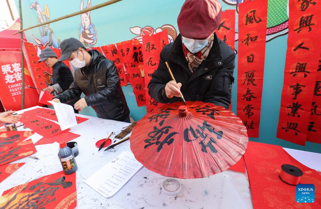 People write auspicious words in Chinese calligraphy as New Year blessings at a shopping festival in Pingyao Town of Yuhang District in Hangzhou City, east China's Zhejiang Province, Jan. 11, 2023.(Xinhua/Xu Yu)