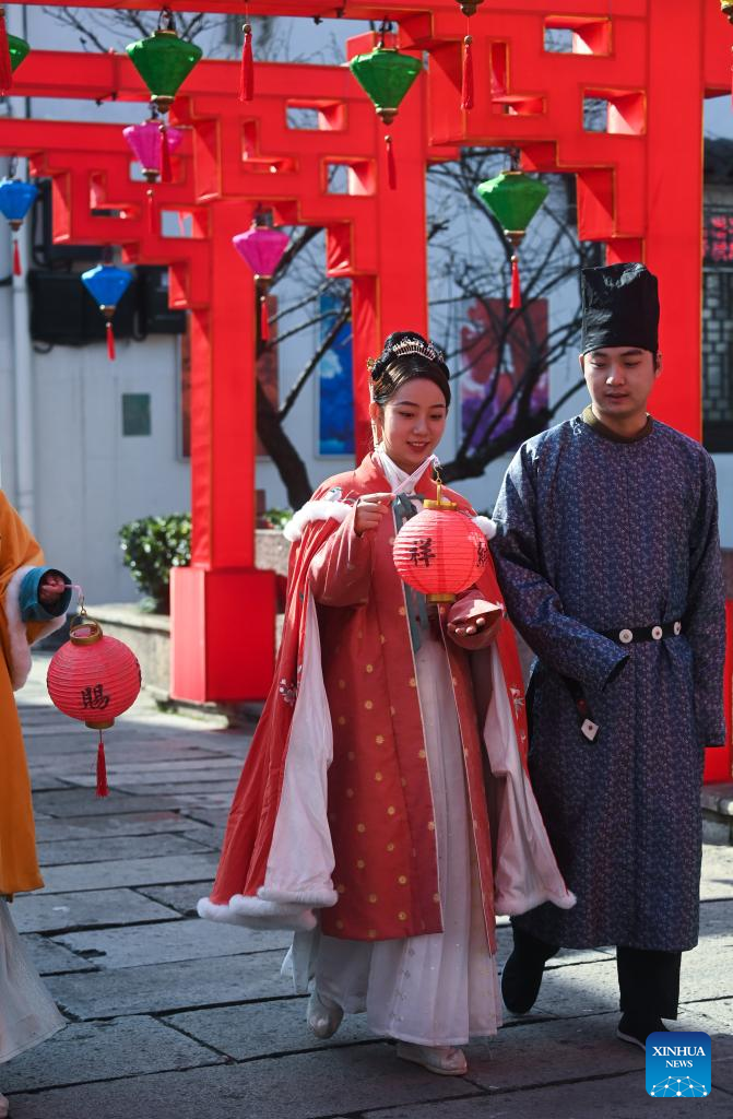 People in traditional Chinese costumes stroll at a shopping festival in Pingyao Town of Yuhang District in Hangzhou City, east China's Zhejiang Province, Jan. 11, 2023. (Xinhua/Xu Yu)