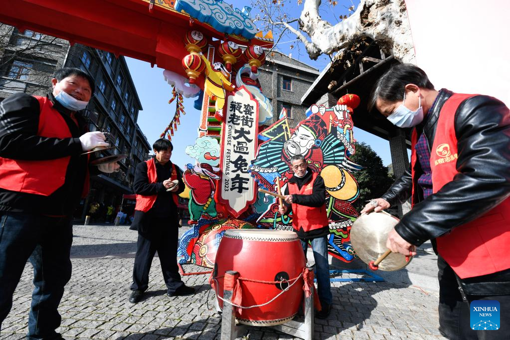 People play traditional Chinese musical instruments to celebrate the opening of a shopping festival in Pingyao Town of Yuhang District in Hangzhou City, east China's Zhejiang Province, Jan. 11, 2023. (Xinhua/Xu Yu)