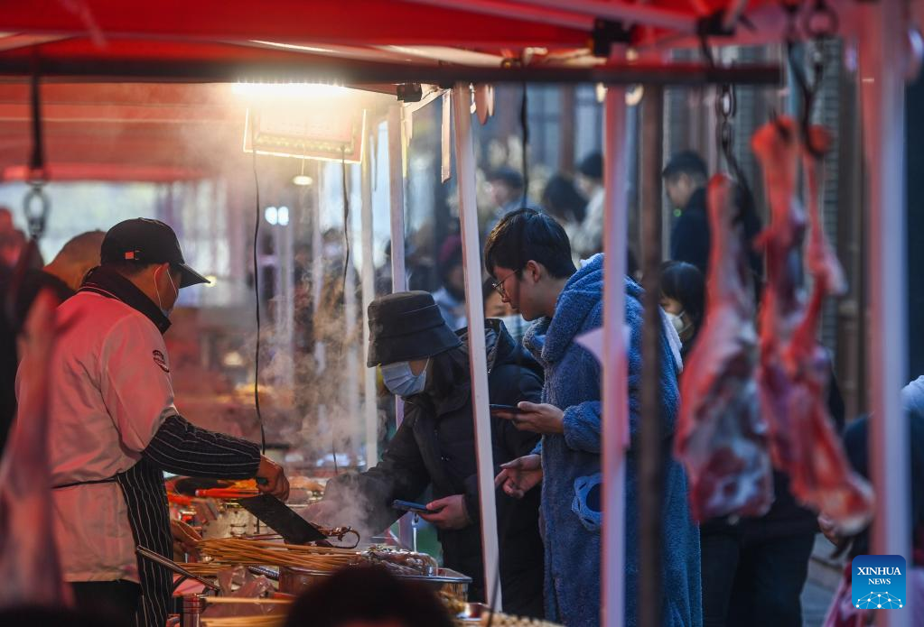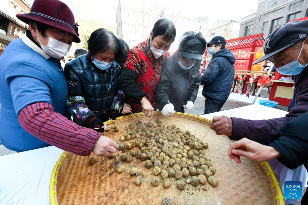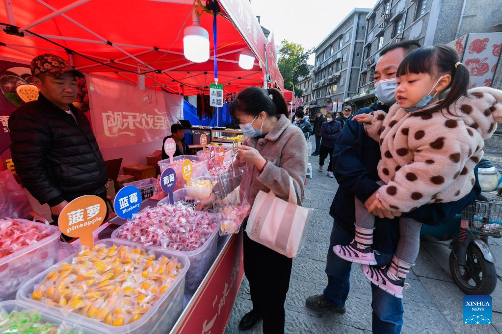 People try local snacks at a shopping festival in Pingyao Town of Yuhang District in Hangzhou City, east China's Zhejiang Province, Jan. 11, 2023. (Xinhua/Xu Yu)
