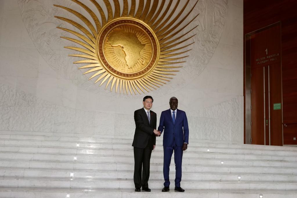 Chinese Foreign Minister Qin Gang (L) shakes hands with African Union (AU) Commission Chairperson Moussa Faki Mahamat after the eighth China-African Union (AU) Strategic Dialogue at the AU headquarters in Addis Ababa, Ethiopia, on Jan. 11, 2023. (Xinhua/Wang Ping)