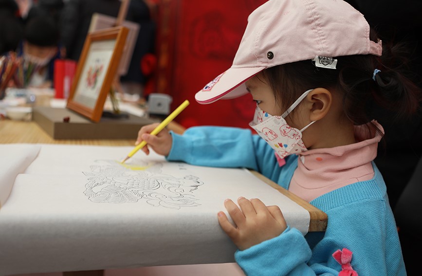 A girl paints a traditional New Year painting at a temple fair in Tianjin, Jan. 10, 2023. (Photo/TYCC)