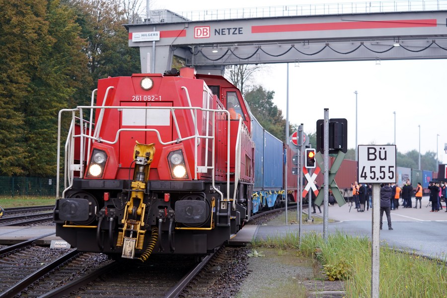 China-Europe freight train "Shanghai Express" is seen in Hamburg, Germany, on Oct. 26, 2021. (Xinhua/Wang Qing)