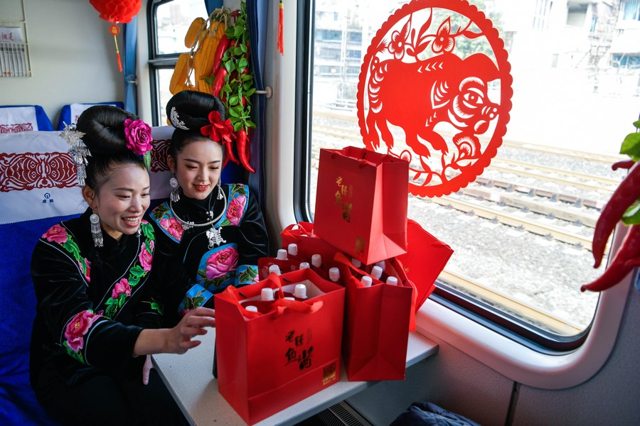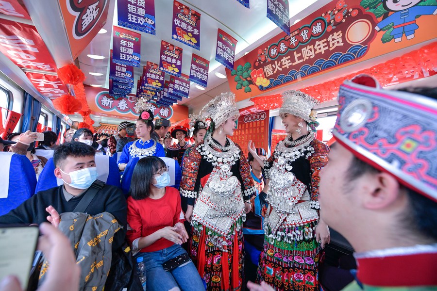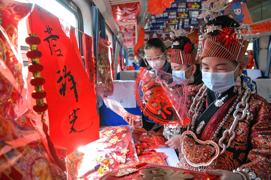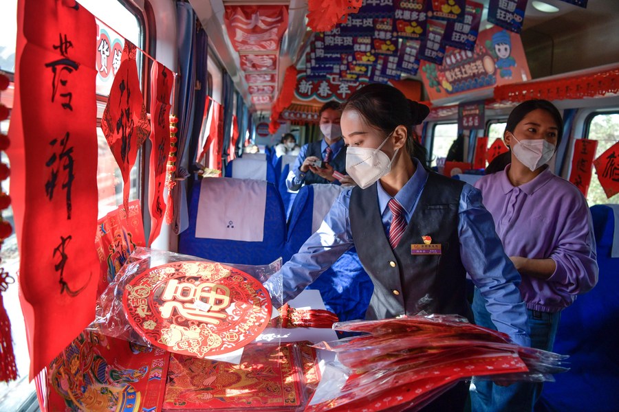 Passengers select new year decorations on train No. 5640 in southwest China's Guizhou Province, Jan. 10, 2023. (Xinhua/Yang Wenbin)