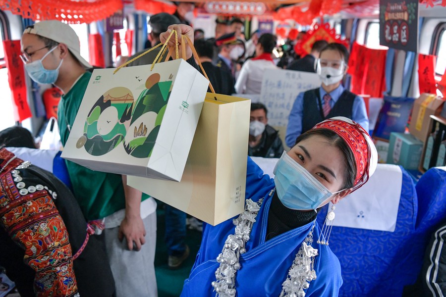 A passenger shows the products she bought on train No. 5640 in southwest China's Guizhou Province, Jan. 10, 2023. (Xinhua/Yang Wenbin)