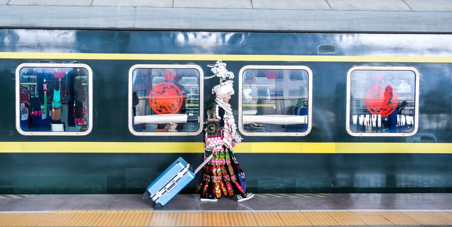 Passengers board train No. 5640 at Kaili Railway Station in Kaili, southwest China's Guizhou Province, Jan. 10, 2023. (Xinhua/Yang Wenbin)