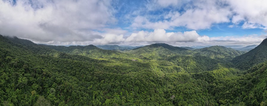 This aerial panoramic photo taken on May 19, 2022 shows a view of the Wuzhishan section of Hainan Tropical Rainforest National Park in Wuzhishan City, south China's Hainan Province. (Xinhua/Zhang Liyun)