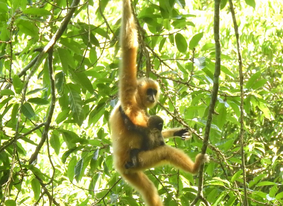 This photo taken in May 2021 shows a Hainan gibbon and its baby ape in south China's Hainan Province. Hainan Tropical Rainforest National Park is the only habitat of Hainan gibbons. (Hainan Tropical Rainforest National Park/Handout via Xinhua)