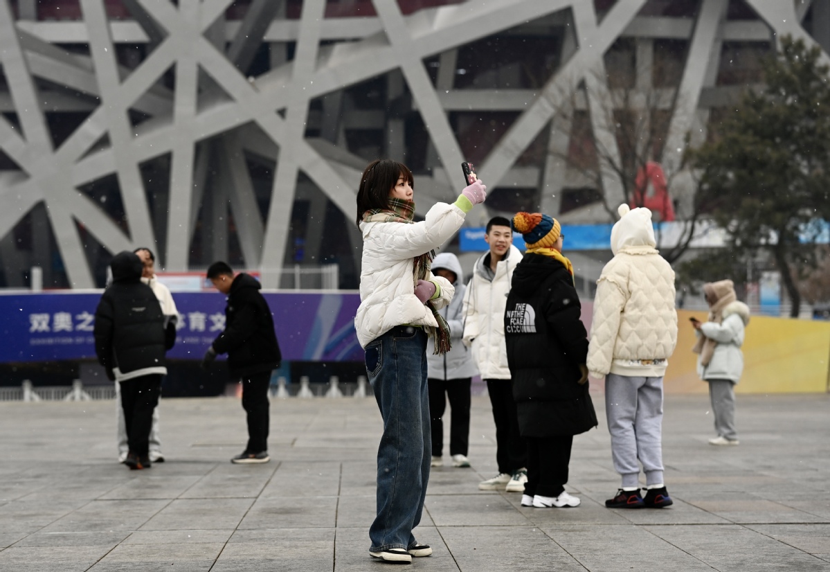 Citizens play in the snow near the National Olympic Stadium in Beijing on Jan 12, 2023. [Photo by Wei Xiaohao/chinadaily.com.cn]