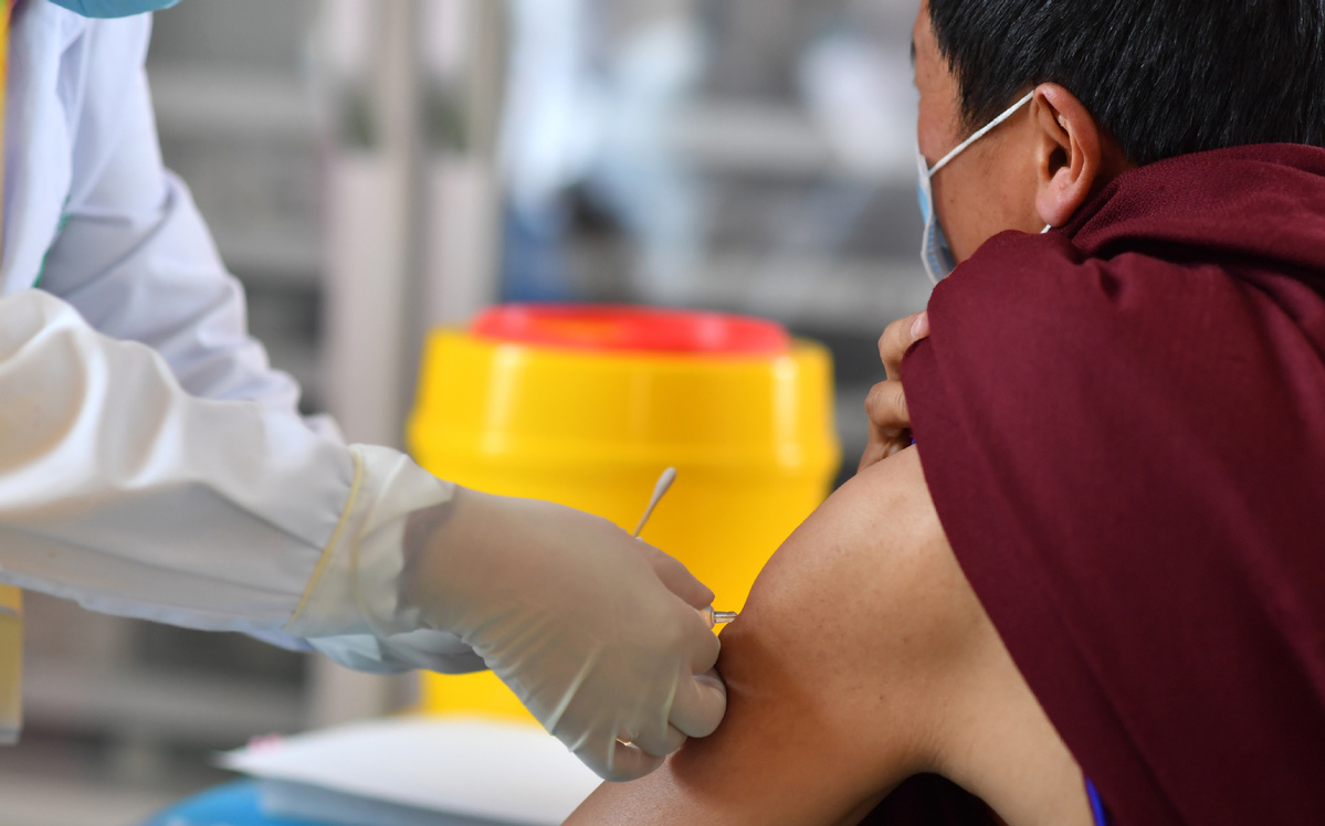 A monk takes a jab of COVID-19 vaccine in Lhasa, Tibet autonomous region, on May 13, 2021. [Photo/Xinhua]