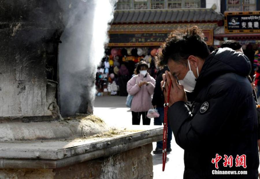 A pilgrim prays for blessing in front of the Jokhang Temple in Lhasa, southwest China's Tibet Autonomous Region Jan. 12, 2023. (Photo: China News Service/Li Lin)