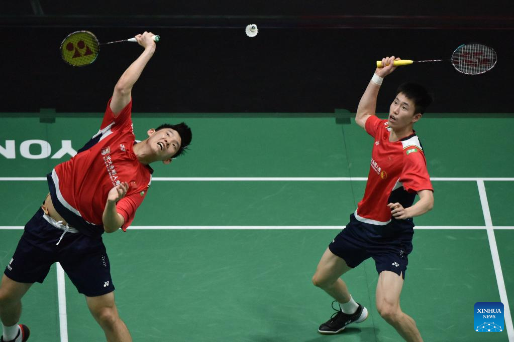 China's Liang Weikeng (R)/Wang Chang compete during the men's doubles round of 16 match against Indonesia's Marcus Fernaldi Gideon/Kevin Sanjaya Sukamuljo at Malaysia Open 2023 in Kuala Lumpur, Malaysia, Jan. 12, 2023. (Xinhua/Zhu Wei)