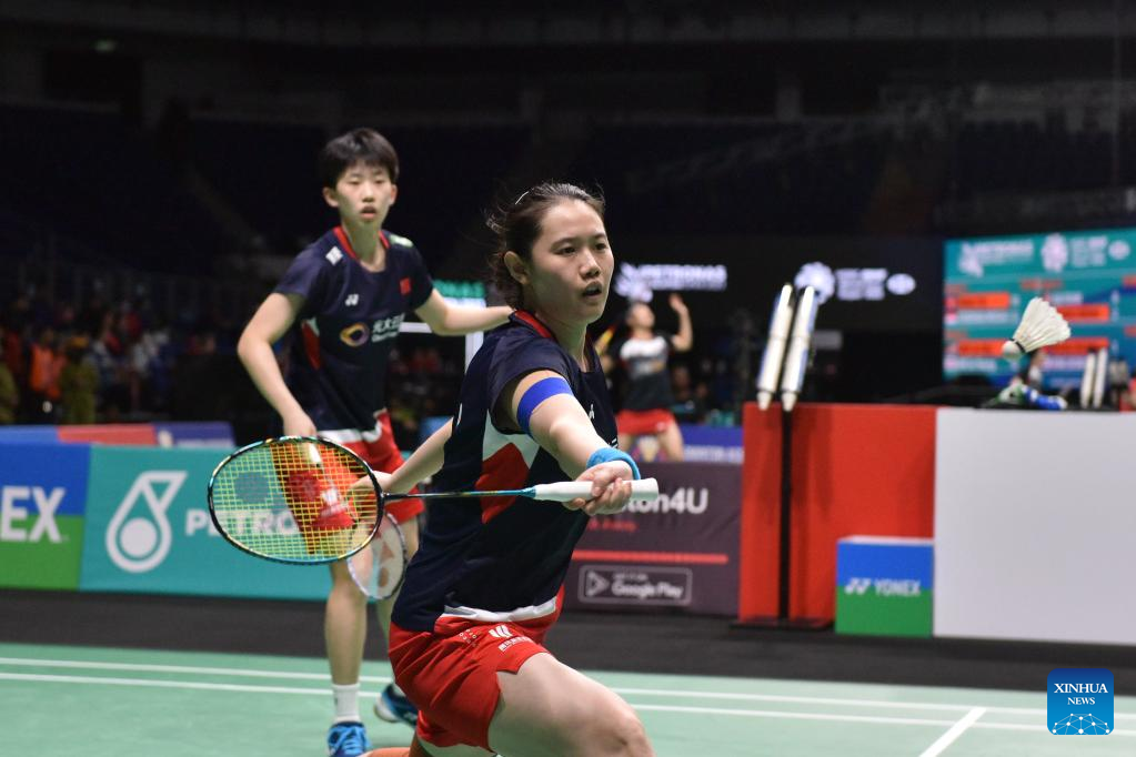 China's Du Yue (R)/Xia Yuting compete during the women's doubles round of 16 match against teammates Li Wenmei/Liu Xuanxuan at Malaysia Open 2023 in Kuala Lumpur, Malaysia, Jan. 12, 2023. (Photo by Chong Voon Chung/Xinhua)