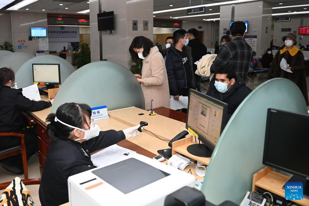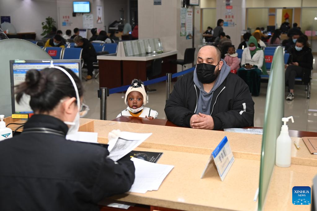 Foreign merchants deal with affairs at the exit-entry administration of the public security bureau in Yiwu, east China's Zhejiang Province, Jan. 11, 2023. According to data from the local exit-entry administration, there have been over 10,000 resident foreign merchants in Yiwu up to now. (Xinhua/Huang Zongzhi)