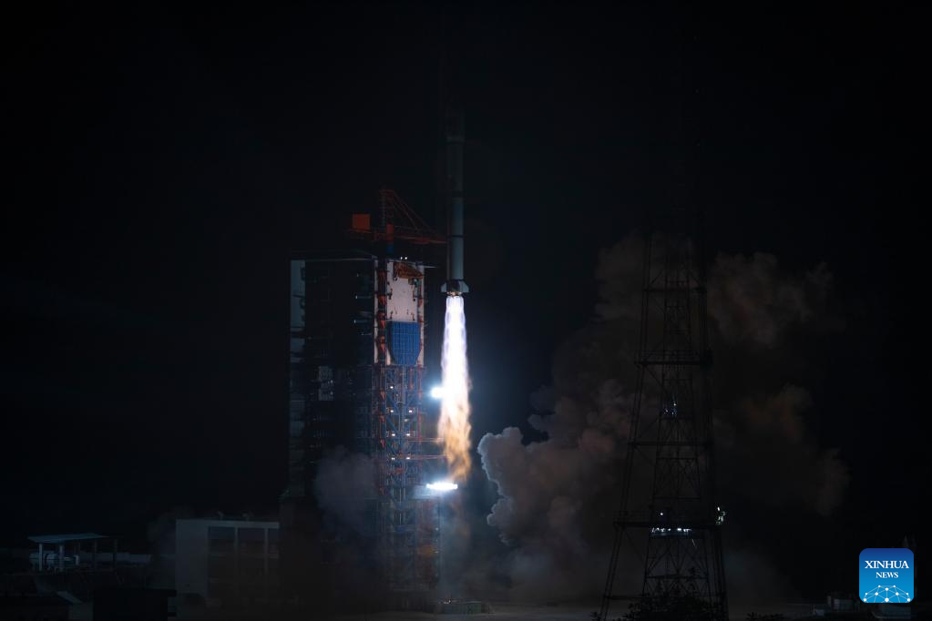 A Long March-2C carrier rocket carrying the APSTAR-6E telecommunication satellite blasts off from the Xichang Satellite Launch Center in southwest China's Sichuan Province on Jan. 13, 2023. The satellite was launched at 2:10 a.m. (Beijing Time) and entered its planned orbit successfully. (Photo by Liu Guanghui/Xinhua)
