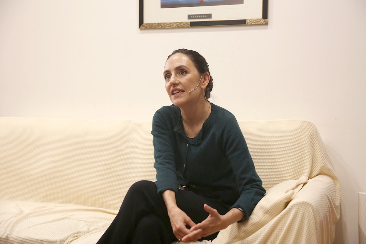 Photo shows Anais Martane, the lead actress and co-producer of Ghetto’s Chinese version, being interviewed at the Poly Theatre, Beijing, Jan. 12, 2023. (People’s Daily Online/Cai Hairuo)