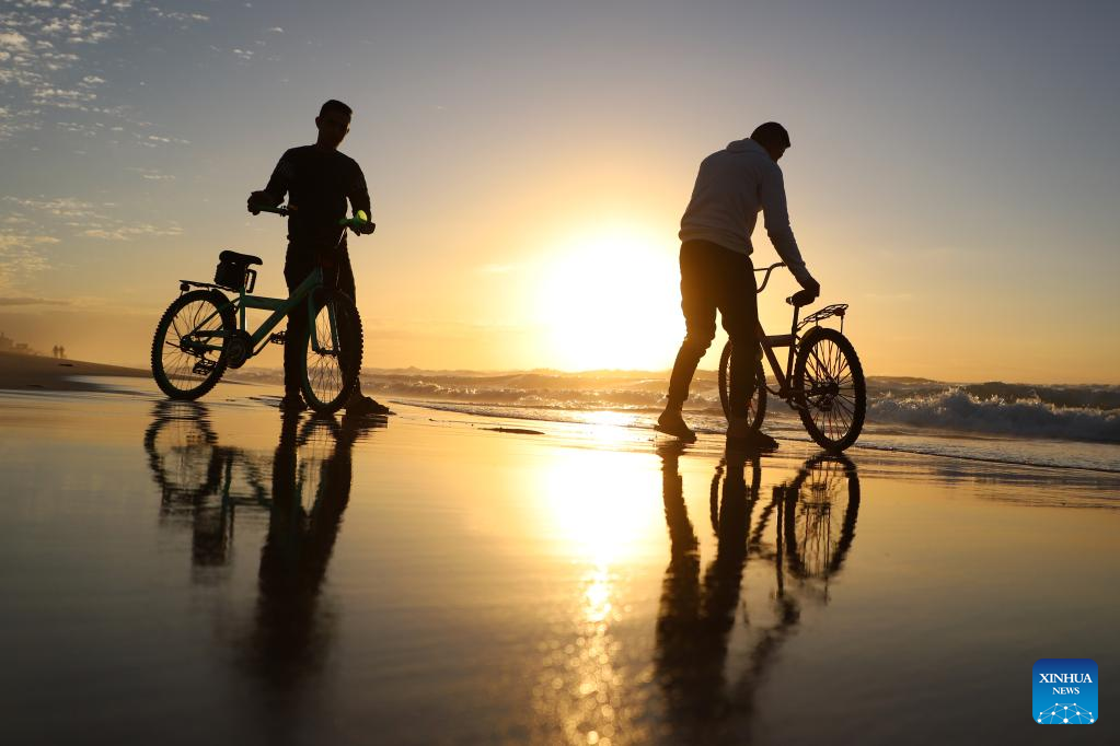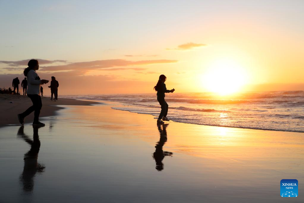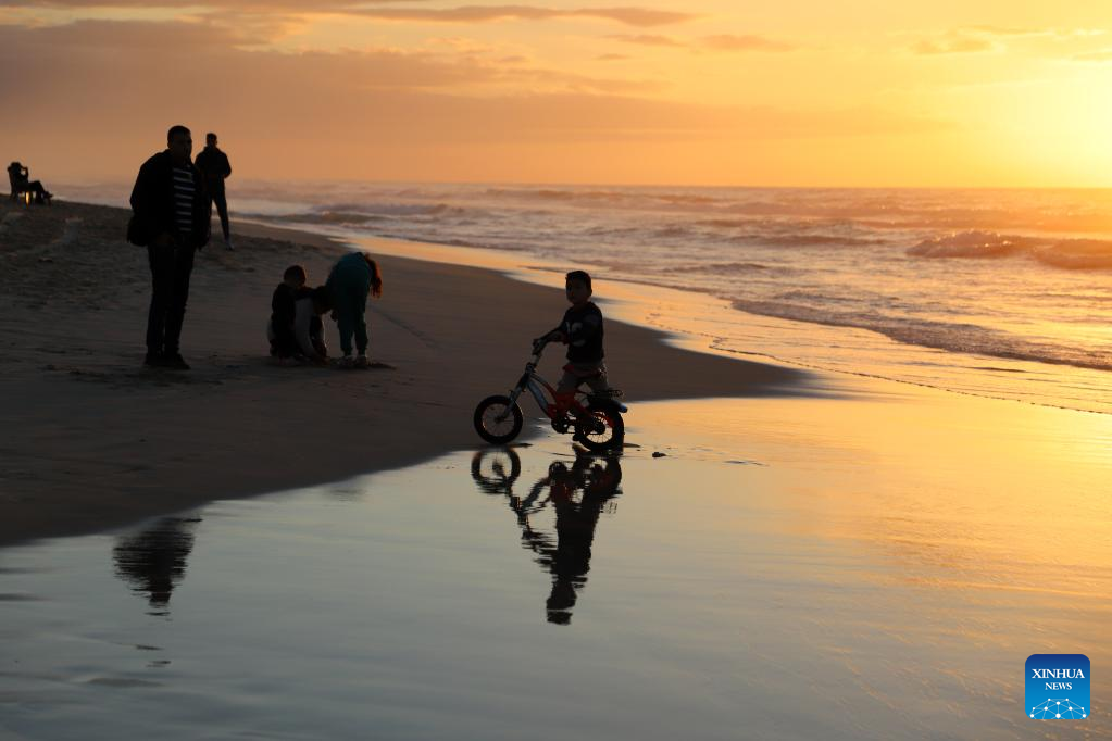 People spend time on a beach of the Mediterranean Sea at sunset in Gaza City, on Jan. 13, 2023. (Photo by Rizek Abdeljawad/Xinhua)