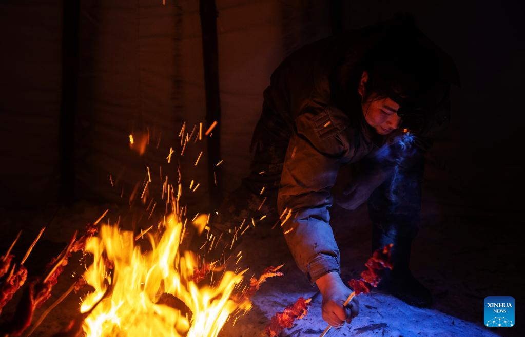 Juele bakes meat on a stove in a tent at a temporary herding station at the Jinhe forest range near Genhe City, north China's Inner Mongolia Autonomous Region, Jan. 12, 2023.