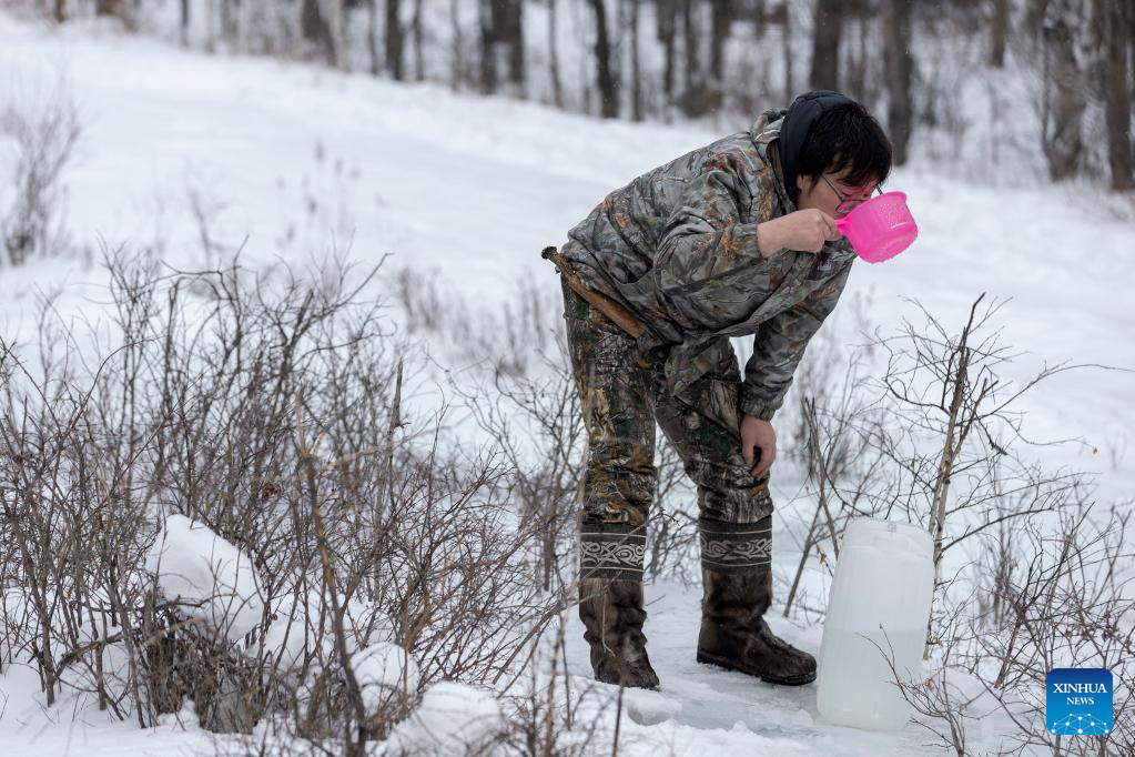 Juele drinks water at the Jinhe forest range near Genhe City, north China's Inner Mongolia Autonomous Region, Jan. 12, 2023.