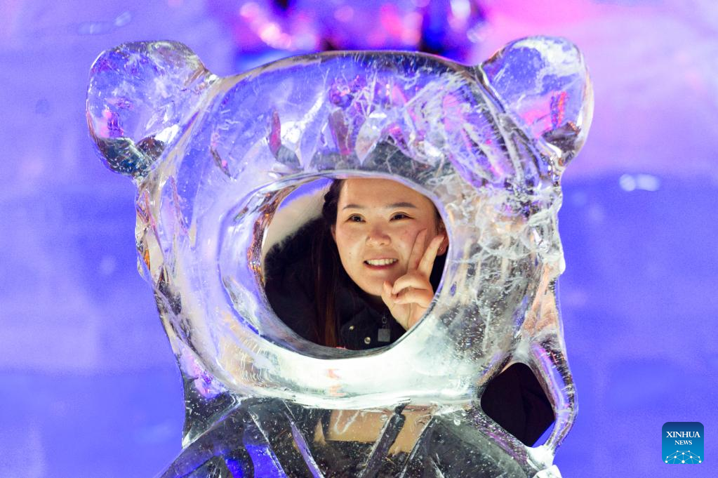 A tourist poses for photos with an ice sculpture in Harbin, northeast China's Heilongjiang Province, Jan. 14, 2023. Harbin is famous for its rich ice and snow resources. This winter, the city opened three ice and snow-themed parks, launched 12 ice and snow experience products and 10 such tourism routes, and created more than 100 related activities to promote the development of winter tourism, culture, fashion and sports. (Xinhua/Xie Jianfei)