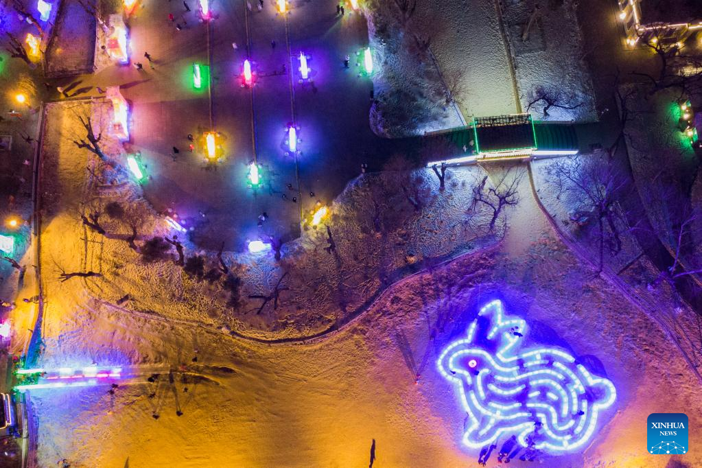 This aerial photo taken on Jan. 14, 2023 shows an ice lantern fair in Harbin, northeast China's Heilongjiang Province. Harbin is famous for its rich ice and snow resources. This winter, the city opened three ice and snow-themed parks, launched 12 ice and snow experience products and 10 such tourism routes, and created more than 100 related activities to promote the development of winter tourism, culture, fashion and sports. (Xinhua/Xie Jianfei)