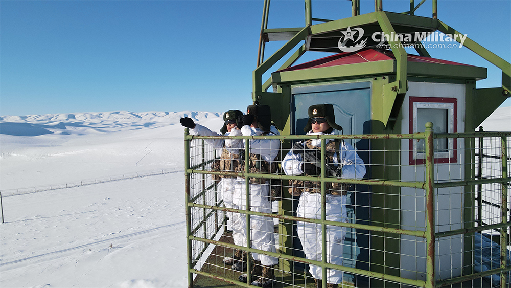 Soldiers assigned to a border defense company of the PLA Xinjiang Military Command stand guard at a border post in late December, 2022. (eng.chinamil.com.cn/Photo by Hou Xiangjun)