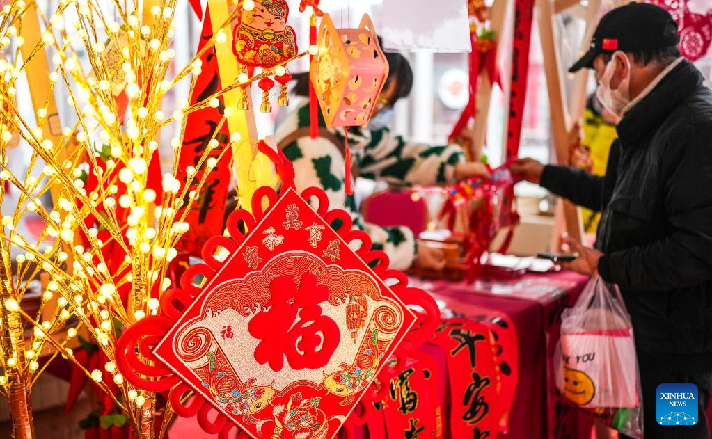 Residents select decorations for the upcoming Spring Festival at a fair along Shanghai Road of Nanning City, south China's Guangxi Zhuang Autonomous Region, Jan. 14, 2023. (Xinhua/Zhou Hua)