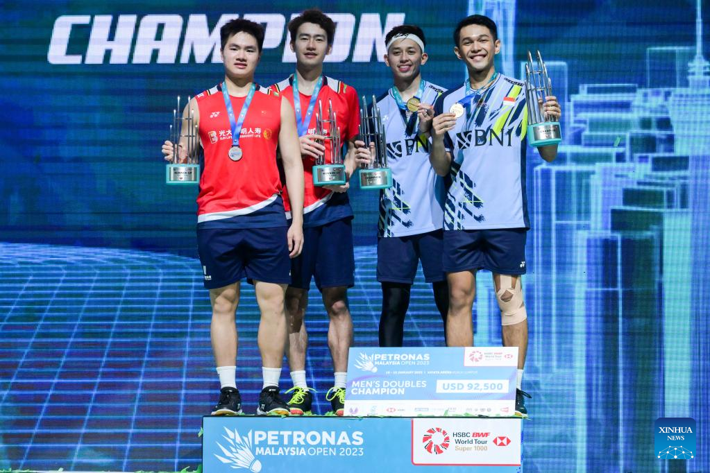 China's Liang Weikeng (1st L)/Wang Chang (2nd L) and Indonesia's Fajar Alfian (1st R)/Muhammad Rian Ardianto pose for photos during the awarding ceremony for the men's doubles at Malaysia Open 2023 in Kuala Lumpur, Malaysia, Jan. 15, 2023. (Xinhua/Zhu Wei)