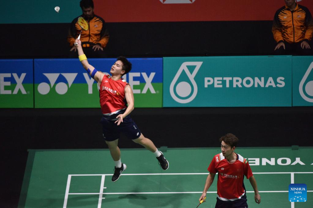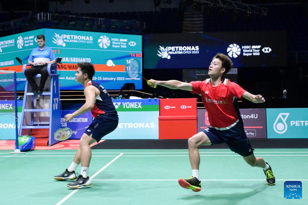 China's Liang Weikeng/Wang Chang (R) compete during the men's doubles final match against Indonesia's Fajar Alfian/ Muhammad Rian Ardianto at Malaysia Open 2023 in Kuala Lumpur, Malaysia, Jan. 15, 2023. (Xinhua/Zhu Wei)