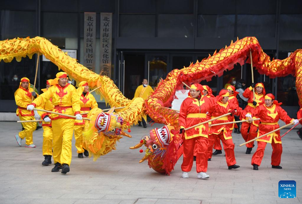 People perform dragon dance outside the north division of Haidian culture center in Haidian District of Beijing, capital of China, Jan. 14, 2023. The Spring Festival culture season kicked off at the north division of Haidian culture center on Saturday, fulfilling the cultural needs of residents with various activities during the Spring Festival. (Xinhua/Ren Chao)