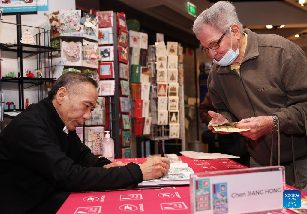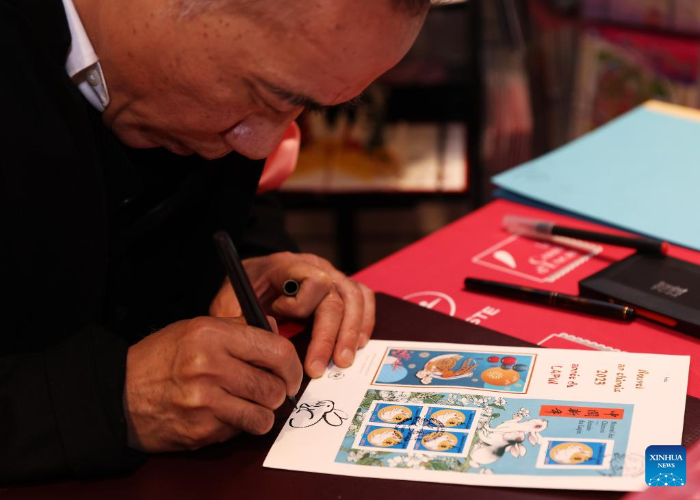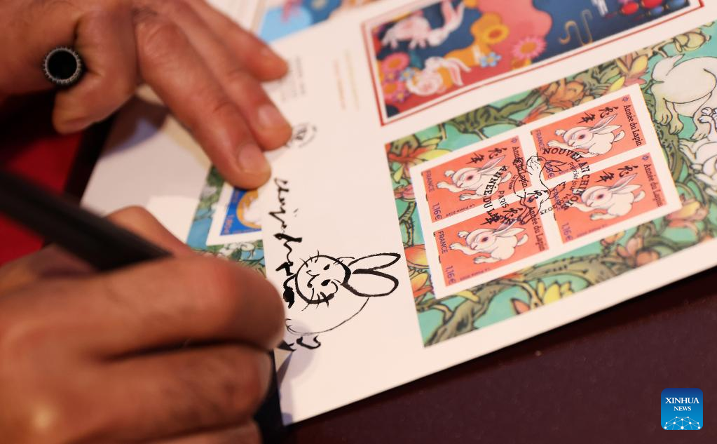 Chinese artist Chen Jianghong signs on the Year of the Rabbit commemorative stamps designed by him during a launching ceremony in Paris, France, Jan. 14, 2023. (Xinhua/Gao Jing)