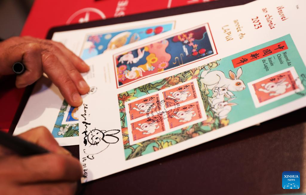 The Year of the Rabbit commemorative stamps, designed by Chinese artist Chen Jianghong, are seen during a launching ceremony in Paris, France, Jan. 14, 2023. (Xinhua/Gao Jing)