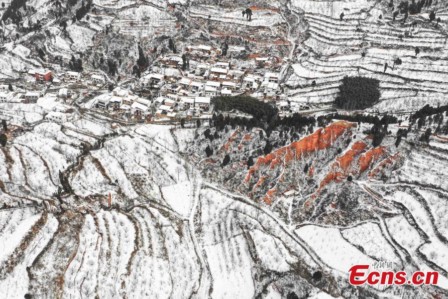 Heavy snowfall hits Hongshigu scenic area in Miaogou Village of Lushi County, central China's Henan Province, Jan. 15, 2023, adding color to its Danxia landform, characterized by reddish sandstone features. (Photo: China News Service/Niu Jinfeng)