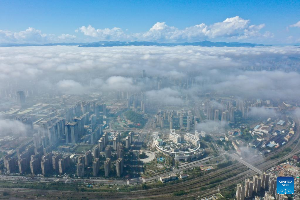 This aerial photo taken on Jan. 14, 2023 shows advection fog which occurs in downtown Fuzhou, southeast China's Fujian Province. (Xinhua/Jiang Kehong)