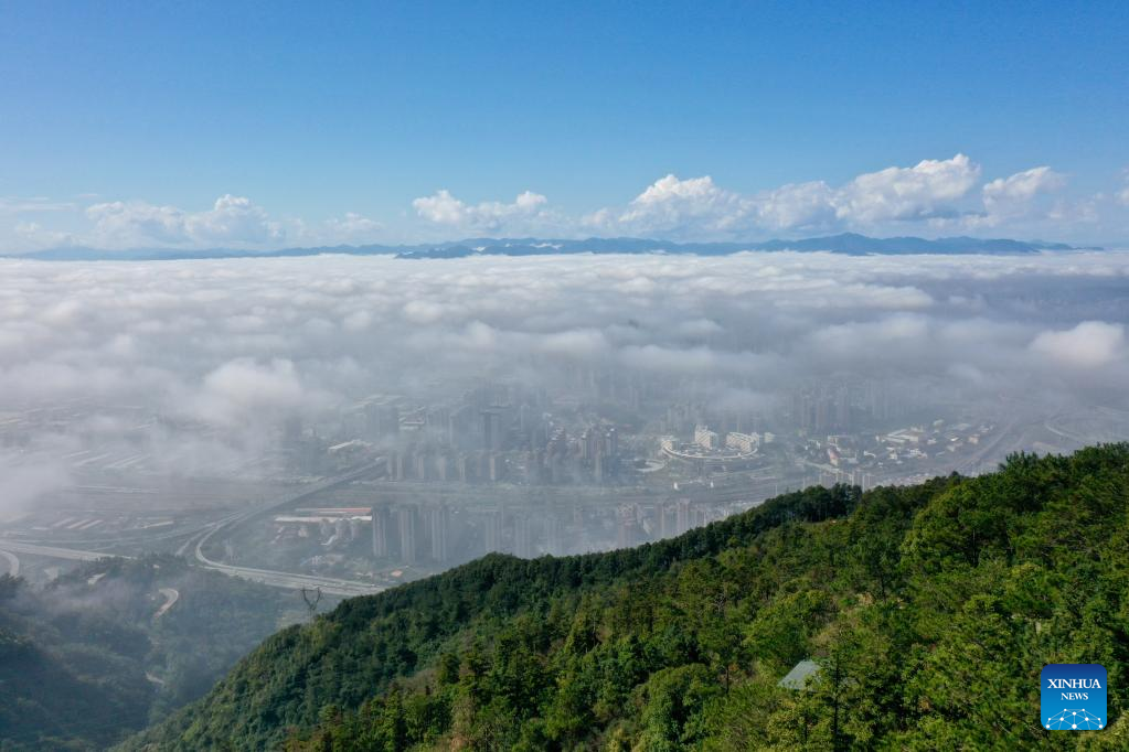 This aerial photo taken on Jan. 14, 2023 shows advection fog which occurs in downtown Fuzhou, southeast China's Fujian Province. (Xinhua/Jiang Kehong)