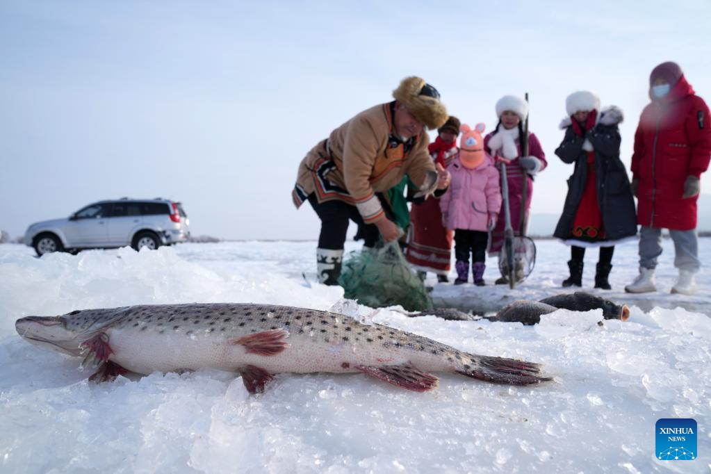 Hezhe people catch fish on the East Lake of Fuyuan City, northeast China's Heilongjiang Province, Jan. 11, 2023. (Xinhua/Wang Jianwei)