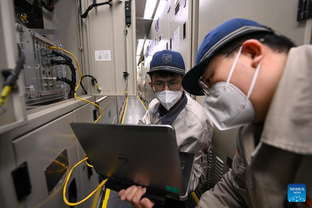 Technicians carry out data analysis at a bullet train maintenance center in Urumqi, northwest China's Xinjiang Uygur Autonomous Region, Jan. 14, 2023. Technicians at a high-speed train maintenance center in Urumqi have been busy carrying out maintenance work for trains during the Spring Festival travel rush. The Spring Festival travel rush, also known as "chunyun," began on Jan. 7 and will last until Feb. 15 this year, during which many Chinese people will travel to reunite with their families for the Chinese Lunar New Year, which falls on Jan. 22 this year. (Xinhua/Ding Lei)