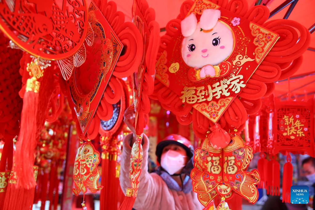 A citizen shops for decorative items for the upcoming Chinese Lunar New Year at a shop in Longhui County of Shaoyang City, central China's Hunan Province, Jan. 16, 2023. As the Chinese Lunar New Year of the Rabbit approaches, decorative items and handicraft works featuring the image of the rabbit, one of the 12 Chinese Zodiac animals, are sweeping the streets, adding festive atmosphere to the event. (Photo by Zeng Yong/Xinhua)