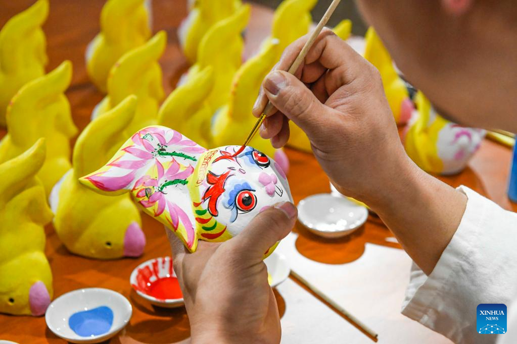A folk artist colours a piece of work at a clay figurine workshop in Yutian County, north China's Hebei Province, Jan. 16, 2023. As the Chinese Lunar New Year of the Rabbit approaches, decorative items and handicraft works featuring the image of the rabbit, one of the 12 Chinese Zodiac animals, are sweeping the streets, adding festive atmosphere to the event. (Photo by Liu Mancang/Xinhua)