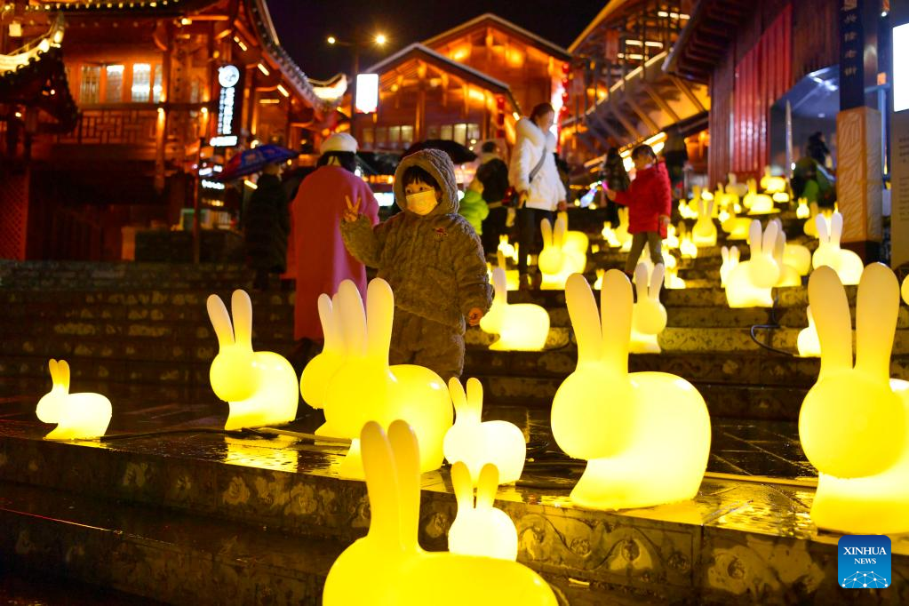 Decorations featuring image of rabbit add festive atmosphere to upcoming Chinese Lunar New Year