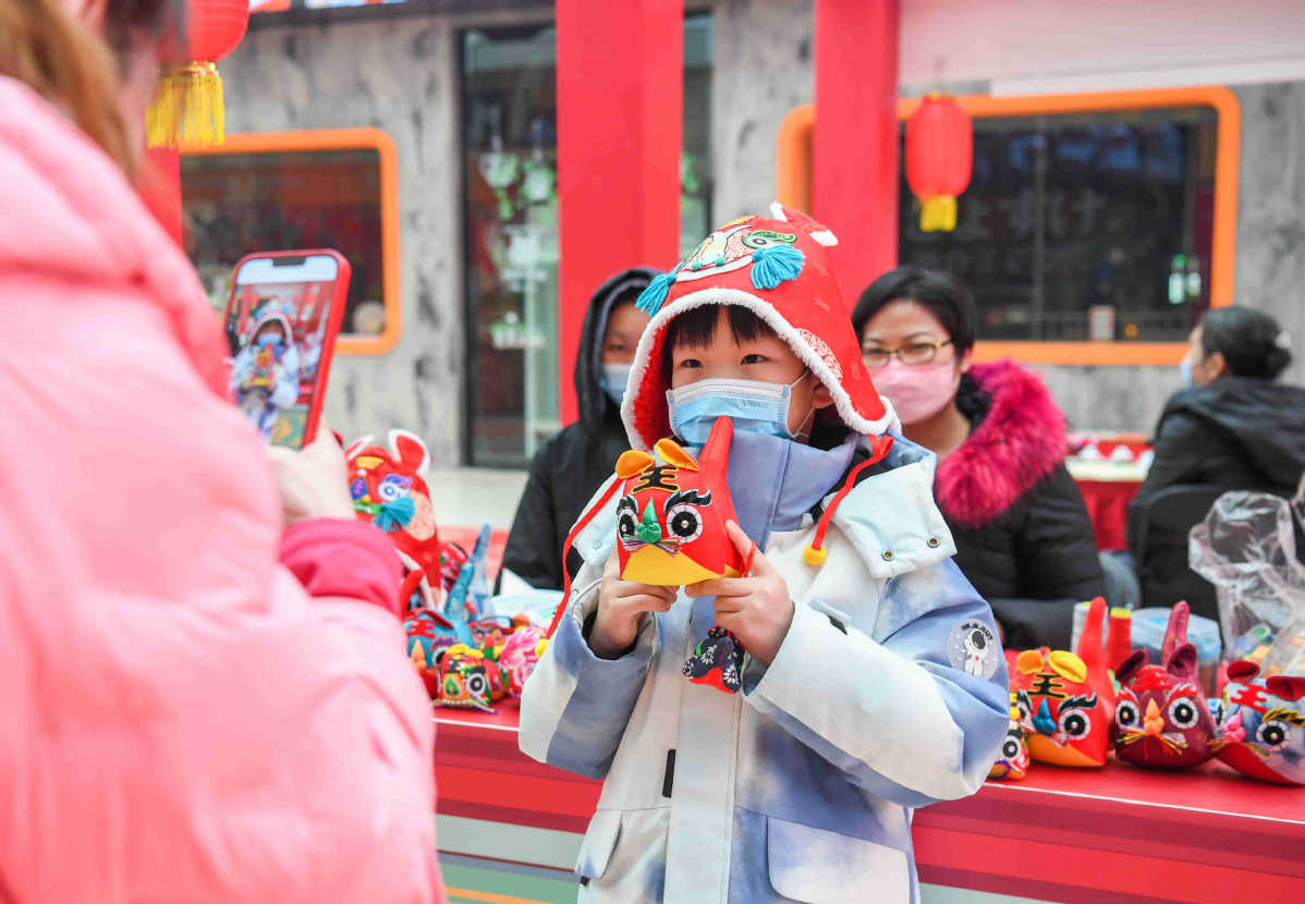 A child presents a cloth-made tiger toy, a traditional folk art, at a Spring Festival market in Tianjin on Jan 11. CHINA DAILY