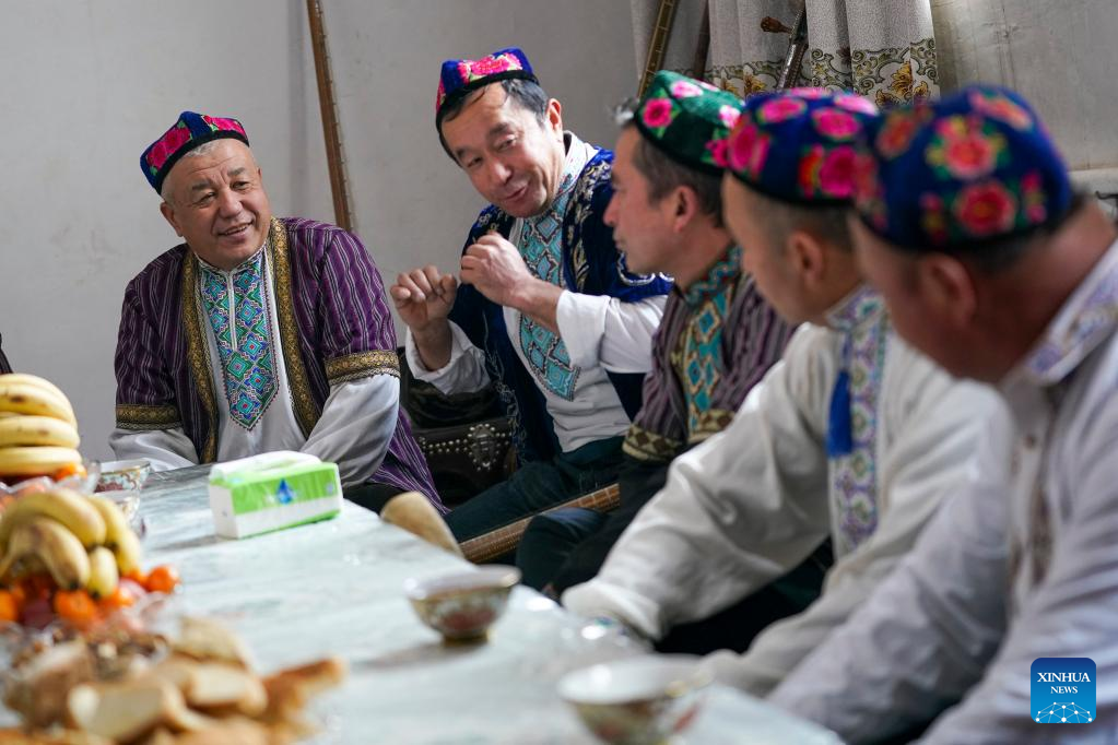 Sulayman Abdu (1st L) chats with other folk artists at his residence in Muqam Village, Lukqun Town, Shanshan County, northwest China's Xinjiang Uygur Autonomous Region, Jan. 11, 2023. With all grape vines buried properly for their protection against cold in winter, people of Lukqun Town in Shanshan have concluded their farm work of the year and started to enjoy a leisure time. However, Sulayman Abdu, a resident of Muqam Village in Lukqun, still has his hands full with performance appointments from his neighbors. Sulayman Abdu, 61, has been studying and practicing Muqam since he was 16, and now has become an inheritor of this popular folk art. Muqam, a traditional art of the Uygur ethnic group in Xinjiang, combines songs, dances, folk and classical music. According to Sulayman Abdu, it has been an age-long custom for local people to watch Muqam performance on occasions of celebration and gathering. (Xinhua/Zhao Ge)