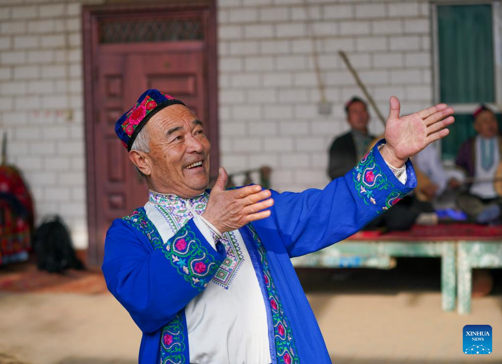 A folk artist rehearses at Sulayman Abdu's residence in Muqam Village, Lukqun Town, Shanshan County, northwest China's Xinjiang Uygur Autonomous Region, Jan. 11, 2023. With all grape vines buried properly for their protection against cold in winter, people of Lukqun Town in Shanshan have concluded their farm work of the year and started to enjoy a leisure time. However, Sulayman Abdu, a resident of Muqam Village in Lukqun, still has his hands full with performance appointments from his neighbors. Sulayman Abdu, 61, has been studying and practicing Muqam since he was 16, and now has become an inheritor of this popular folk art. Muqam, a traditional art of the Uygur ethnic group in Xinjiang, combines songs, dances, folk and classical music. According to Sulayman Abdu, it has been an age-long custom for local people to watch Muqam performance on occasions of celebration and gathering. (Xinhua/Zhao Ge)