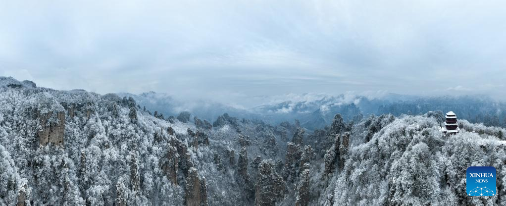 This aerial panorama photo taken on Jan. 16, 2023 shows a view of the snow-covered Tianzi Mountain in Zhangjiajie City in central China's Hunan Province. (Xinhua/Zhao Zhongzhi)