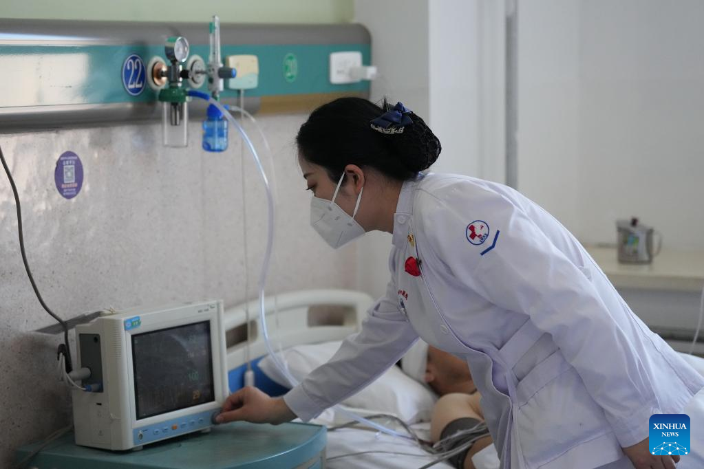A nurse checks on an injured victim of a chemical plant explosion at the Panjin Central Hospital in Panjin, northeast China's Liaoning Province, Jan. 16, 2023. (Xinhua/Pan Yulong)
